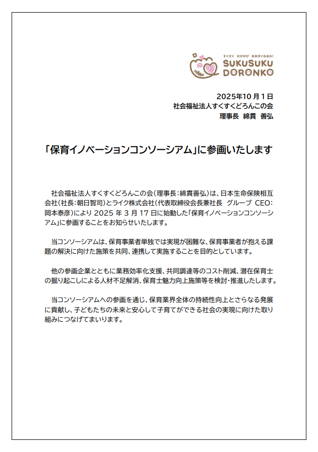 Information お知らせ Home お知らせ 保育イノベーションコンソーシアム参画のお知らせ お知らせ 保育イノベーションコンソーシアム参画のお知らせ 2025年10月1日 新しい記事へ 古い記事へ お知らせ一覧へ